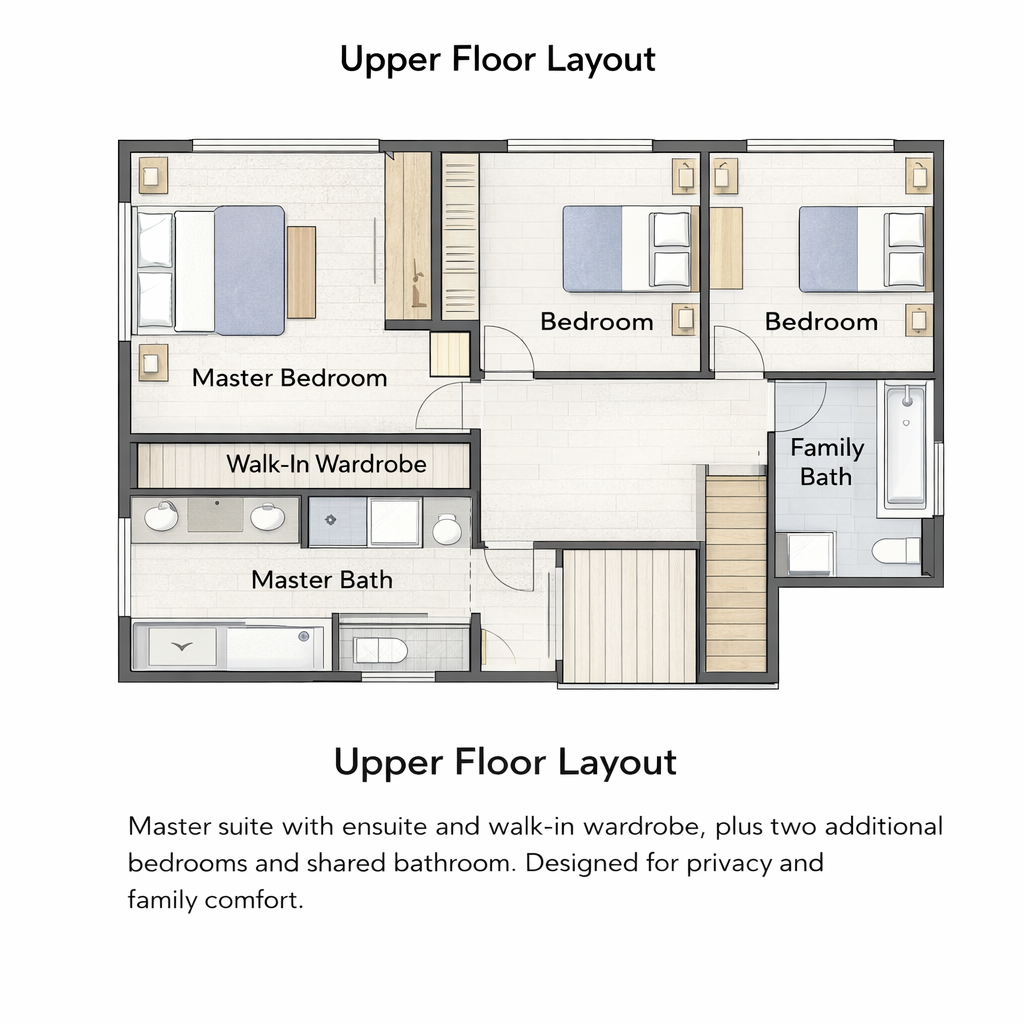 Master suite with ensuite and walk-in wardrobe, plus two additional bedrooms and shared bathroom. Designed for privacy and family comfort.