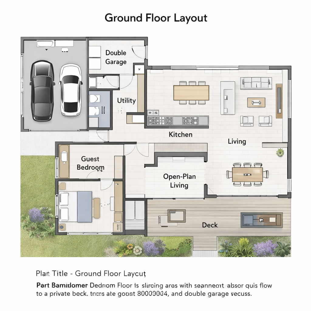 Open-plan living, dining, and kitchen area with seamless indoor-outdoor flow to a private deck. Includes guest bedroom, bathroom, and double garage access.